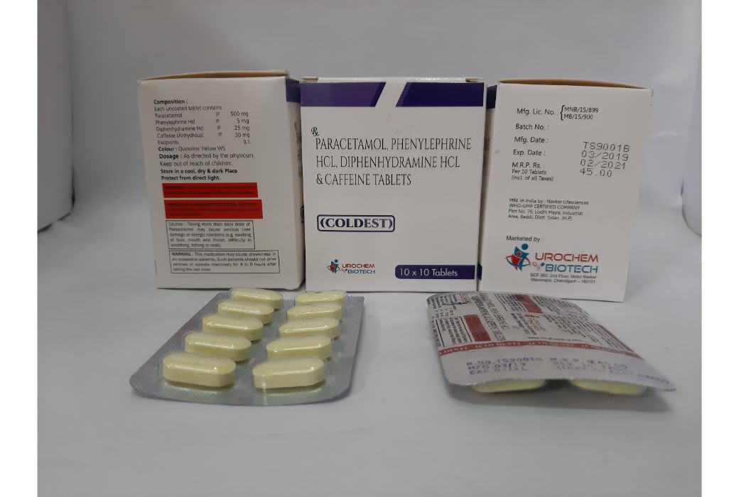 • Composition : Paracetamol IP 500 mg + Phenylephrine Hydrochloride IP 5mg + Diphenhydramine Hydrochloride IP 25 mg + Caffeine IP 30 mg